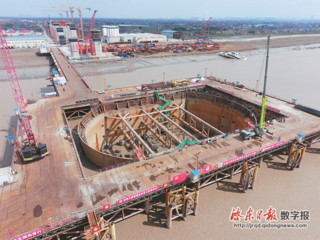 3月1日,在我市北新镇万安村,崇启公铁长江大桥主航道4号墩钢围堰内混凝土垫层已灌注完成,76根钻孔桩桩头已凿除完成53根;南岸崇明岛上3号主墩近百名员工也在同步作业,进行钻孔桩桩头凿除、吊装、围堰内清淤等工序施工。据了解,两个主墩3月底进行混凝土浇筑,5月份进行主塔施工。