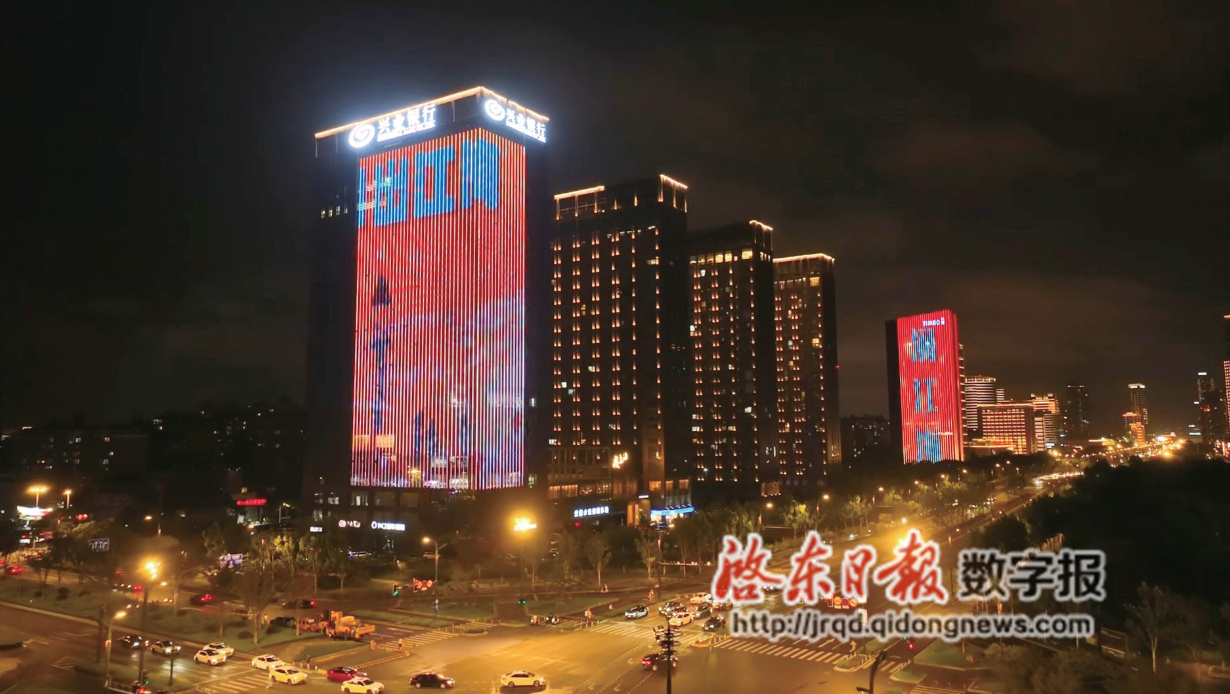 9月26日晚,在南通市区世纪大道与工农路交汇处的繁华路口,三座毗邻的大厦化身流光溢彩的巨型画布,以灯光为笔,勾勒出一幅幅充满启东风情的绚丽画面,成为南通夜空最耀眼的风景线(如图)。