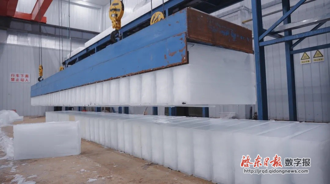 走进吕四渔港制冰有限公司的制冰间,机械化操作的行车正吊着一排排铁槽模具从制冰池转移至脱模池。只见机器将整排模具浸入常温水中,经过来回多次的浸泡和摇晃之后,冰块的边缘开始融化,与铁皮分离后便可以顺利地从模具中脱出,并滑行至输送轨道,进入冷库。随后,这些铁桶重新注水,进入循环生产。在制冰池中静止大约12个小时后,冰块便能成型。