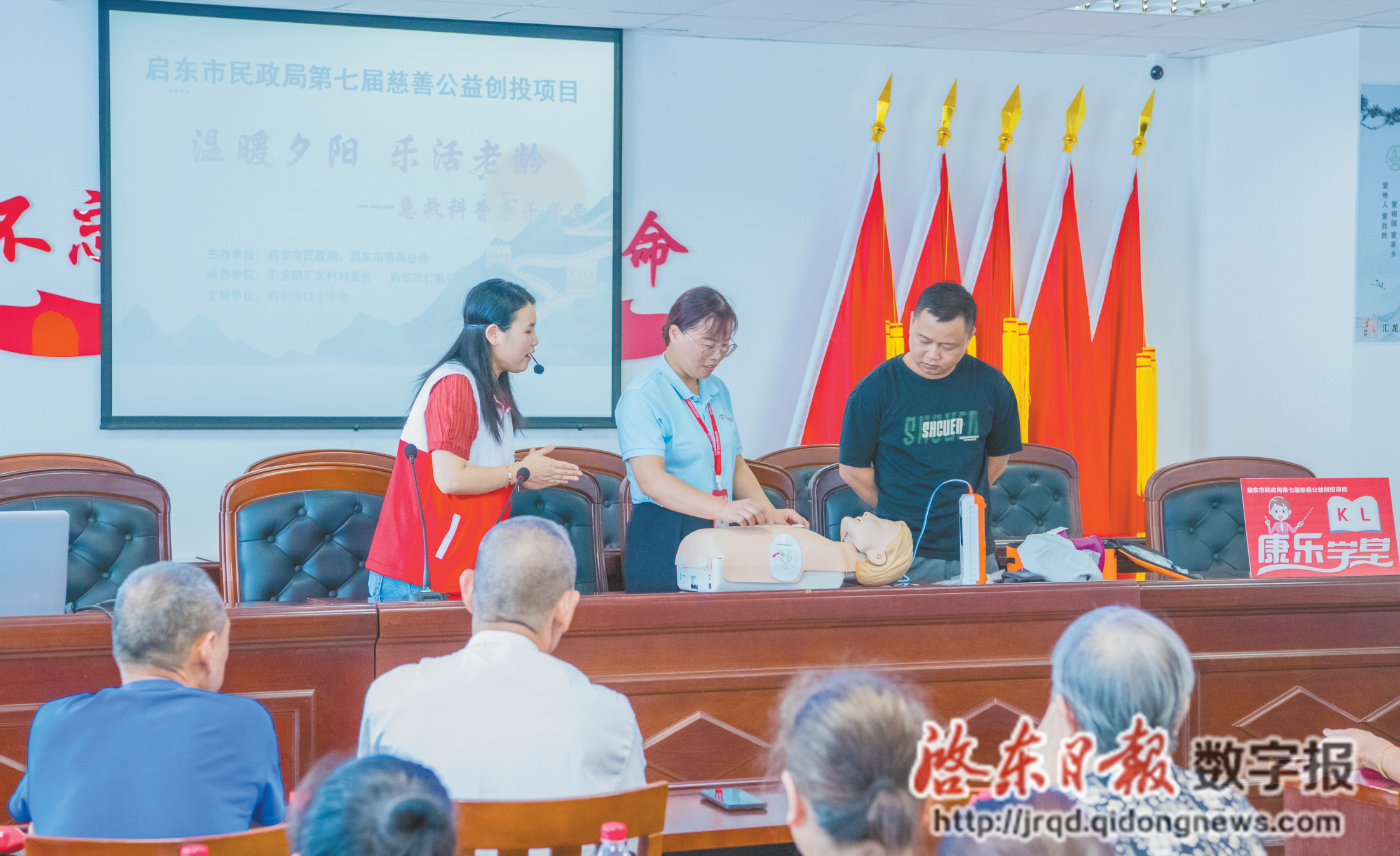 日前,由市仁惠公益协会、汇龙镇汇东村村委会联合开展的市民政局第七届慈善公益创投项目——“康乐学堂”急救科普课堂正式开课。课上,市红十字会急救培训老师重点围绕各种突发意外事件,向学员们重点介绍心肺复苏术、AED(自动体外除颤仪)的使用知识,并现场邀请学员们上台,互动演示急救技能。