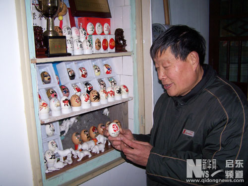 在一个橱柜里,记者又看到了一排绘有京剧脸谱、动物和书画的蛋壳,这也是顾锡田的“新作”。去年,他的老伴在电视上看到有人在蛋壳上画画、写字,便鼓励顾锡田也尝试一下。于是,老两口买回很多鸡蛋,用针在蛋壳上刺孔后,倒出蛋黄、蛋清,然后顾锡田就在空蛋壳上自由创作。目前,顾锡田已经创作了80多只蛋壳艺术品。