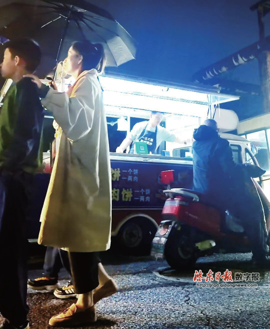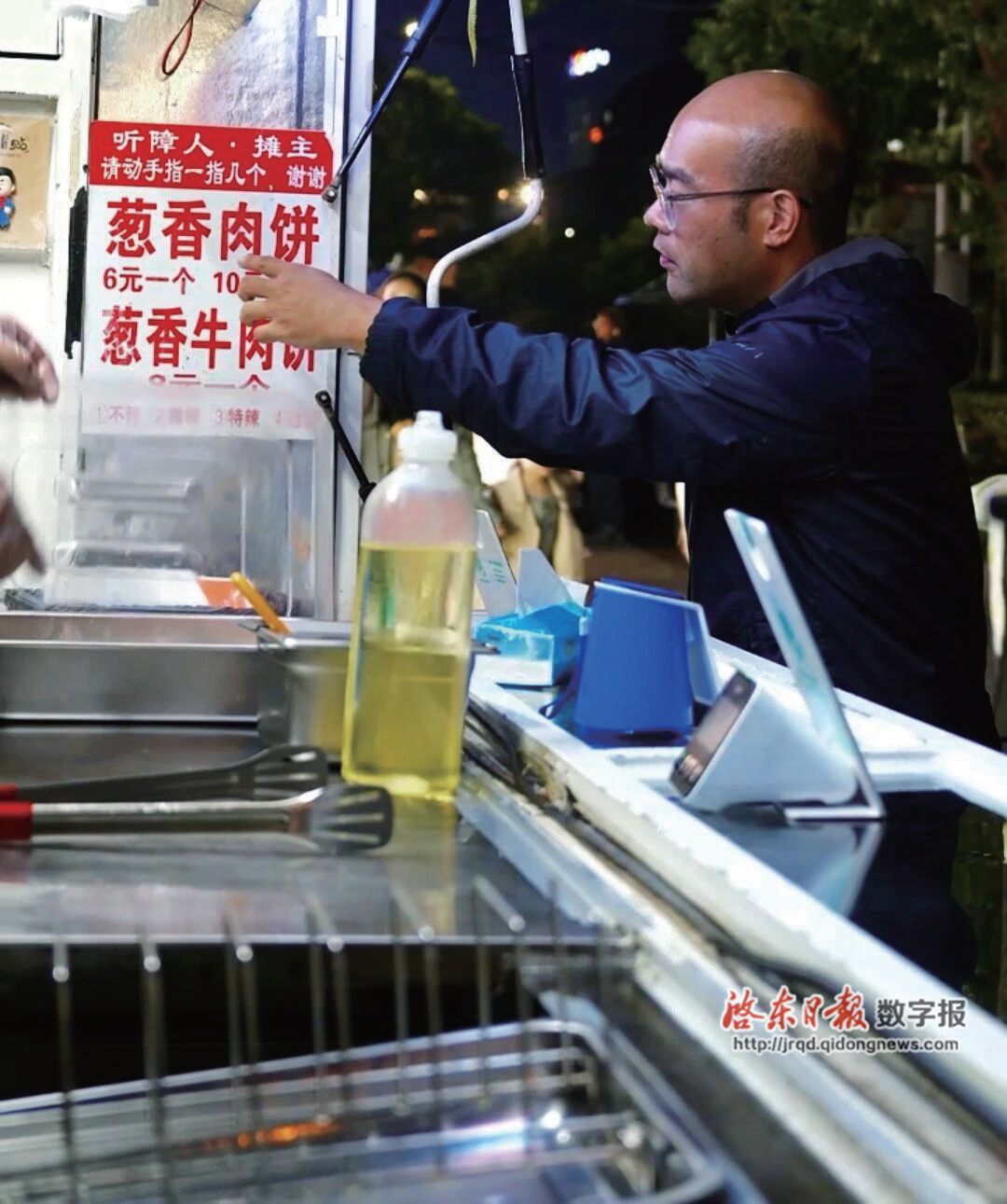傍晚6点,市区林洋路夜市,人群渐密,嚣声四起。在道路西侧,一个标着“香葱鲜肉饼”的摊位准时亮起蓝色灯光。