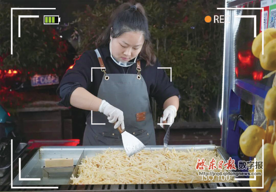 对于这份计划外的“第二职业”,两人最初只是悄悄尝试。“在工作室聊起吕四夜市的好生意,我说‘咱能搞不?’搭档回一句‘成本不高就试呗’。”顾凤笑得爽朗。虽然准备初期并非一帆风顺,土豆丝碎烂、忙乱误工等问题接踵而至,但当得知她们的规划,家人和朋友纷纷表示支持,两人的母亲常来帮忙削土豆等,摆摊事业渐渐走上正轨。“多亏家人和朋友援手,10月25日我们的土豆饼小车终于开张了。”顾凤表示,利用夜晚空闲做喜欢的事,即便辛苦,也甘之如饴。