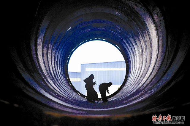 4月24日,蓝岛海工重型海上风能装备专业生产车间内机声隆隆,工人们正在有条不紊地忙碌。