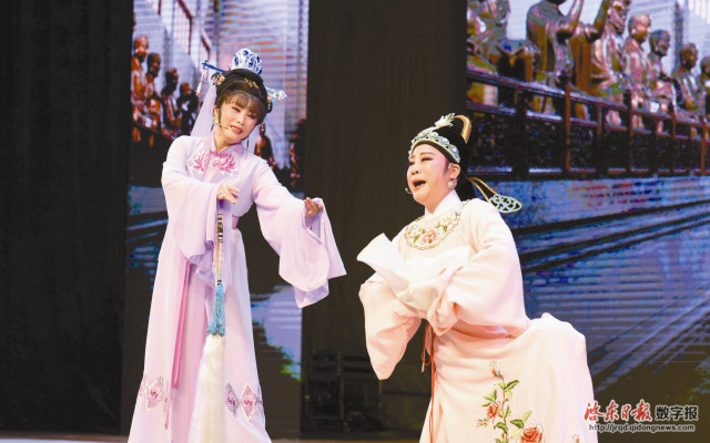 4月27日下午,市文联“五月风”系列活动——诗画启东越韵江海第五届越剧折子戏专场,在启东宾馆会议中心演出。来自上海的国家一级越剧演员丁小娃、傅幸文和我市越剧团演员同台表演的《玉蜻蜓—拒子认子》等折子戏,赢得了在场观众的热烈掌声。图为两地演员同台表演《玉蜻蜓》。
