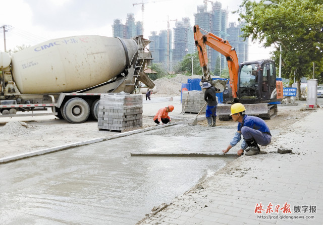 市区河南东路、建设路口道路改造工程加快推进。6月16日,工人铺设北侧人行道路基。该路段于今年年初开工建设,接下来将进行路面沥青铺设,预计8月份全面竣工。