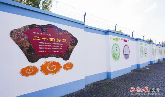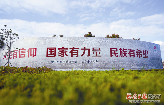 公园道广场前,版画《长江岸边我的家》铺底,灰白色调,意境悠远,“人民有信仰、国家有力量、民族有希望”铿锵有力。灵秀东路北侧,小桥、流水、垒石,寥寥数笔的水墨,勾勒文明人的素养与文明城的底气。城西海四达转盘往北,青瓦白墙的江南古建与温、良、恭、俭、诚等中华民族的传统美德相融相合。公园南路市行政中心对面,百余米手绘墙上,有贯彻党的十九大精神的“撸起袖子加油干”、有讲文明树新风的“争做文明有礼启东人”,白底黑字,简约方格、红色点缀,是岁月沉淀下的中国风。甚至,人民路文峰路口,一只配电箱也被水墨渲染,成了文明宣传的阵地。