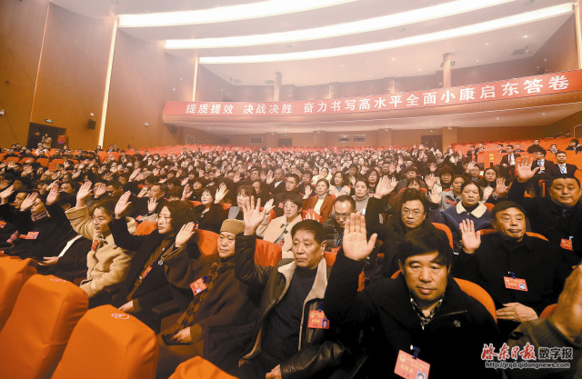 市委书记王晓斌在大会结束前讲话。他说,启东市十七届人大四次会议圆满完成了各项议程,即将胜利闭幕。这是一次高举旗帜、牢记使命的大会,是一次凝聚共识、团结鼓劲的大会。会议期间,各位代表以饱满的政治热情和高度的政治责任感,依法行使职权,严守会风会纪,展现出了过硬的政治素养和良好的精神风貌。会议通过的各项报告和决议,票决产生的2020年民生实事项目,明确的全市经济社会发展奋斗目标和主要任务,凝聚着全体代表的智慧,反映了人民群众的心声。