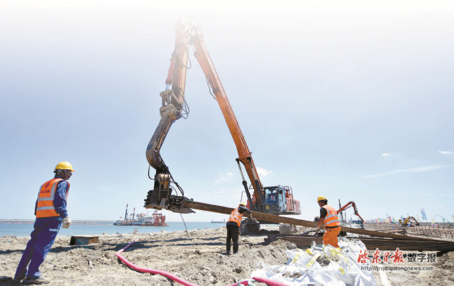 沉桩作业在加班加点,陆域地基处理也如火如荼。“咚、咚、咚……”“2+2”码头B标段现场,5台打板机正在插打排水板。“我们采用管井加排水板工艺,可以长期有效排水,进而提高地基承载力和强度。”“2+2”码头B标现场技术员邓宇龙介绍,施工单位增加机械设备,实施不停息作业,提高排水板插打效率。