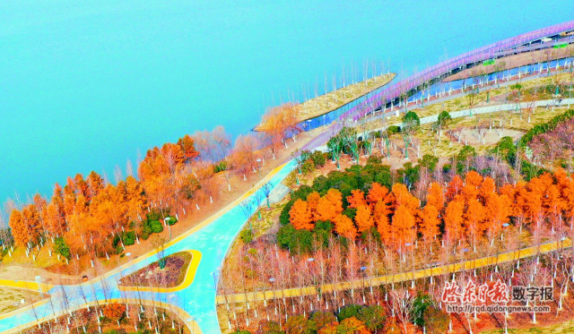 1月28日,新城区蝶湖畔,色彩缤纷的树木与湛蓝的湖水交相辉映,美丽如画。
