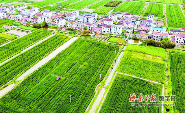 4月18日,东海镇东海镇村的彩萍家庭农场基地内,农场主正用新式植保机给小麦喷药除菌治虫。该农场今年种植小麦300余亩,预计6月初成熟收割。