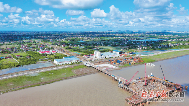 初夏雨水洗礼后的天空格外湛蓝,让崇启公铁长江大桥南北主塔墩施工现场也成了一道美丽的风景线。目前,崇启公铁长江大桥南、北桥塔桩基施工完成,这条世界最大跨度、双塔双索面、公铁两用无砟轨道斜拉桥主体工程已经取得阶段性进展,正在为8月上旬主墩钢围堰下放做准备工作。